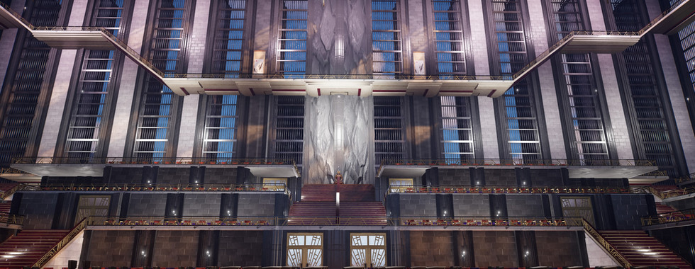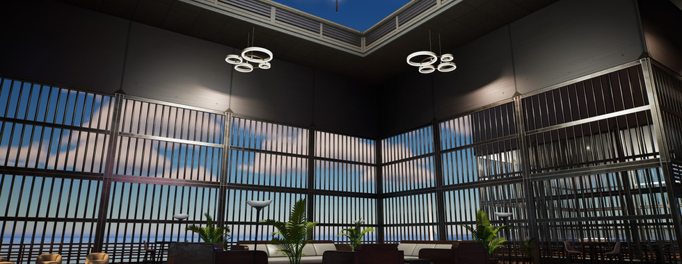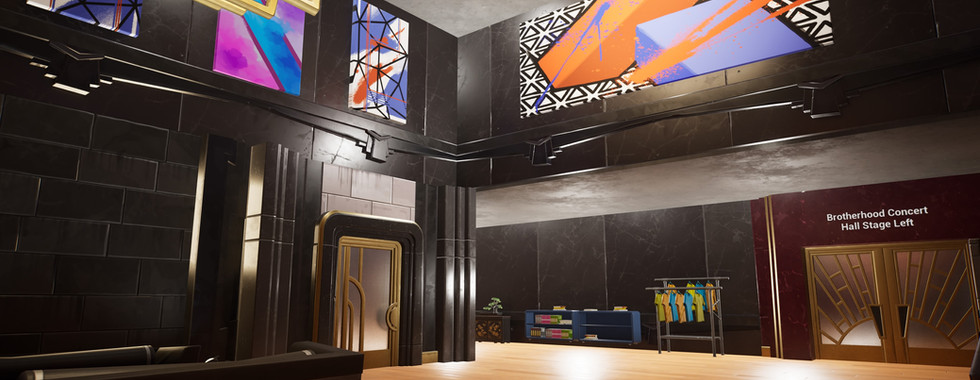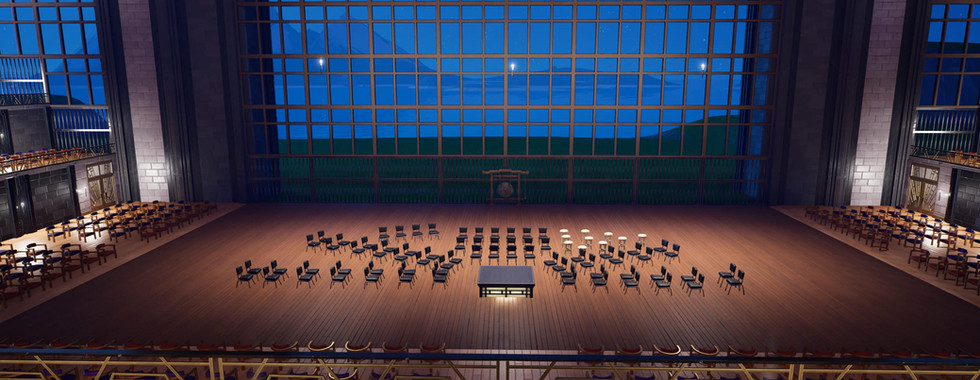 The hall's interior design is a mix of wood, steel, and brick. It has a big, open window behind the main stage showing the brilliant mountain in the distance. The hall has 3 main levels. Placing all of the seats and lighting the place was TEDIOUS. I did my best 😄. Something I really tried to get right was the proportions from the seating area to the stage—something I thought about in each of the performance spaces. I wanted to ensure that there were really no bad seats in the house! Too bad concerts can't ever happen in here! 😭