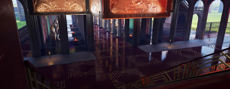 In terms of design influence, you'll notice the long arches I snagged from the castle pack. I was going for a very "Lincoln Center-Esque" feel. They permeate throughout the 1st floor of the complex, from the foyer to the largest concert space. The coolest feature about the foyer is the color gradient spiked ceiling! I first made the spikes by taking single ribbed vaulted roof platforms that had points on the end of each corner and combined them in consecutive rows of 6 to form the spikes. I then placed EACH LIGHT individually by grid snapping them to fit inside each spike. The trickiest part of this was choosing one slightly different color variant after another to ensure a smooth set of gradients across the length of the foyer. Here's a video walkthrough of the entrance/foyer: