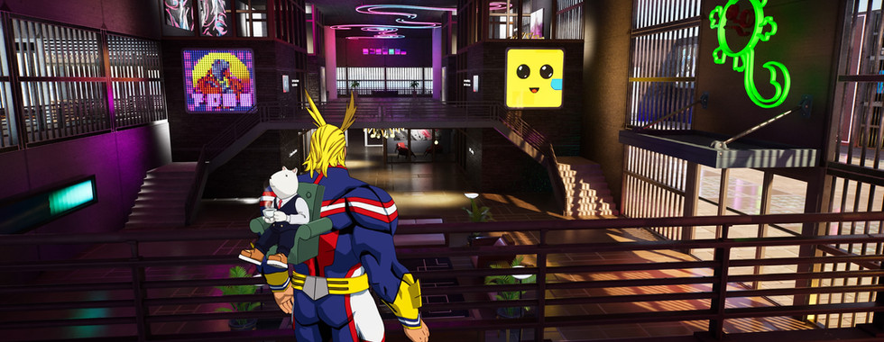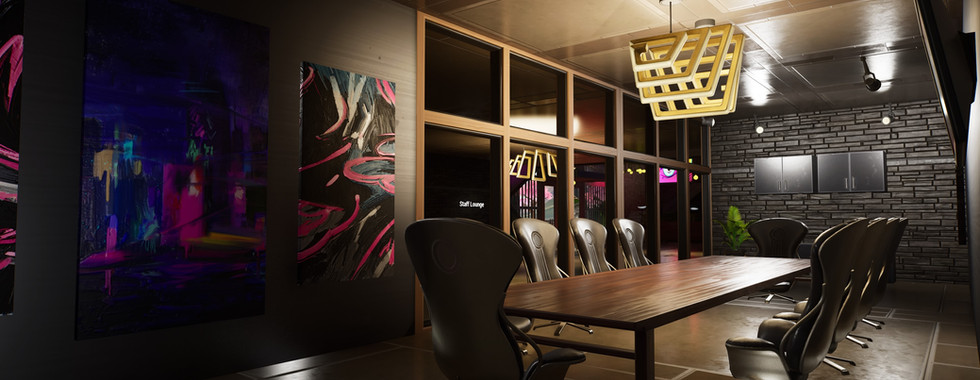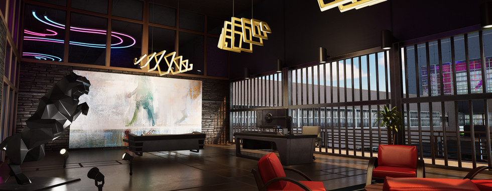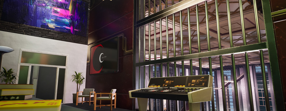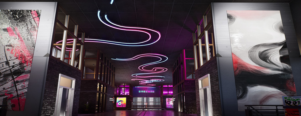 God of Gaming Plaza is a musically active space between the 2 office wings of the FCPA. The large light panels on the walls change color and react rhythmically to the music. The ground is also lined with active color coded pathways. I added some cool signage from a city/business pack as well.